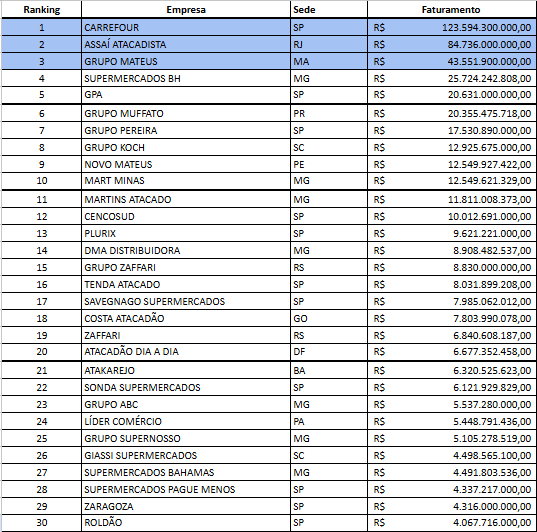 O segundo colocado no Ranking ABRAS, o Assaí Atacadista, com faturamento de R$ 84,7 bilhões, sendo seguido pelo Grupo Mateus, que manteve a posição dos últimos dois anos, com 43,5 bilhões. O quarto lugar, ficou com o Supermercados BH, pelo segundo ano consecutivo, tendo apurado no período R$ 25,7 bilhões.